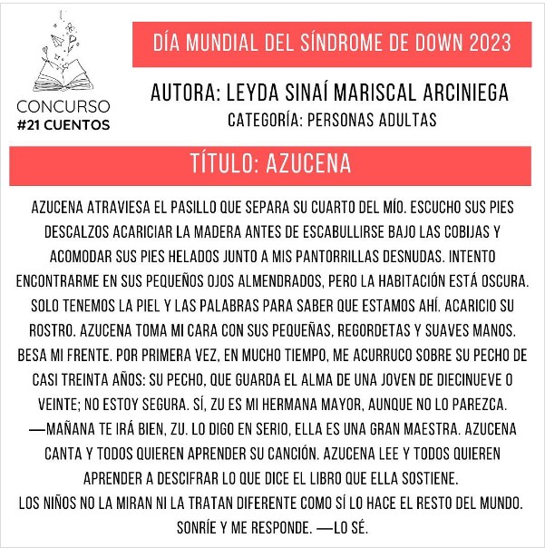 El 28 de marzo de 2023, se realizó la entrega de reconocimientos del «Concurso 21 cuentos», iniciativa organizada por el Centro UC Síndrome de Down, que este año recibió 107 propuestas escritas no sólo por personas con síndrome de Down, sino también profesionales y familiares que viven en su entorno, tanto de Chile como de México, Perú, República Dominicana, Estados Unidos y Argentina.