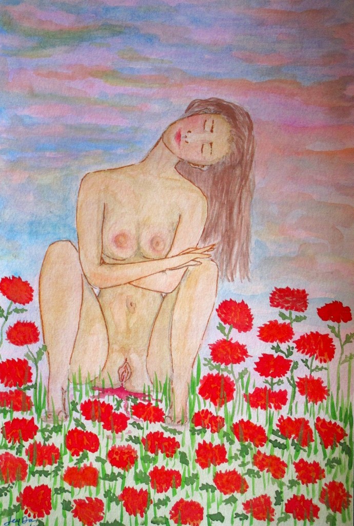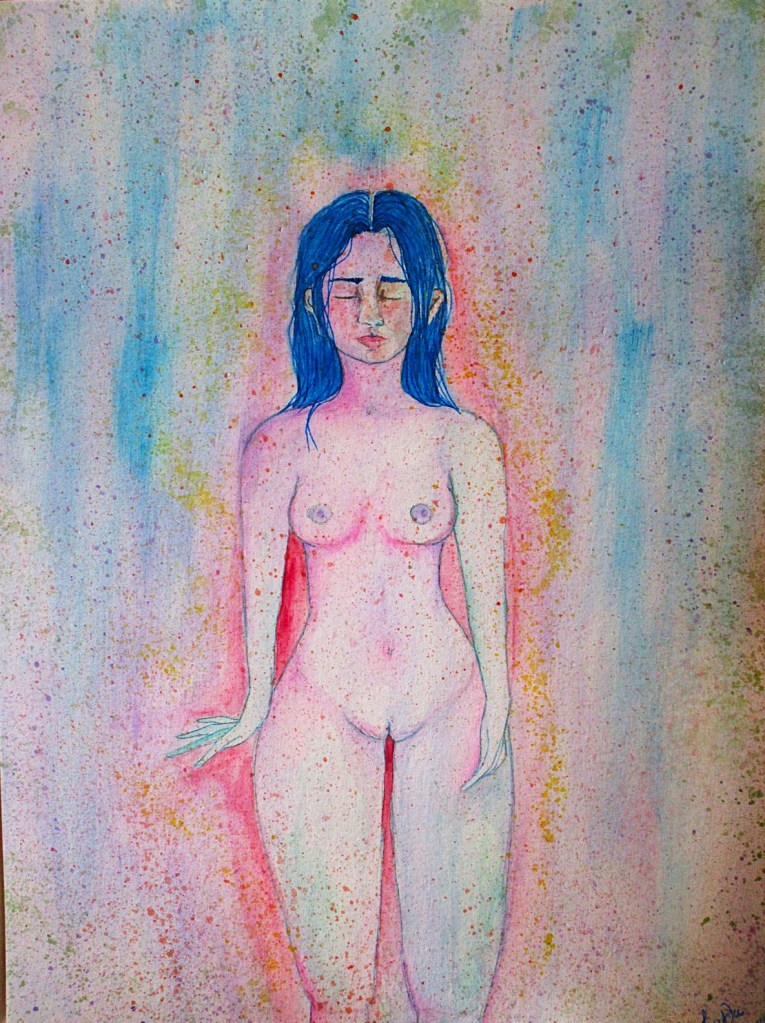 «Aldonza toma su mejor pincel biselado, comienza a pintar con paciencia los bordes perfectamente imperfectos de su cuerpo, cambia de técnicas, combina colores, la música sigue y se sumerge en la creación de los detalles de su propia piel: pintando manchas, lunares, rojos, negros, cafés; curvas, líneas, una variedad de cicatrices, un mapa de estrías, ríos de piel agrietada que corren por toda la espalda; vellos en los dedos de los pies, en las piernas, vellos púbicos (obviamente), en el abdomen, en los pezones, en las axilas, en el rostro.«